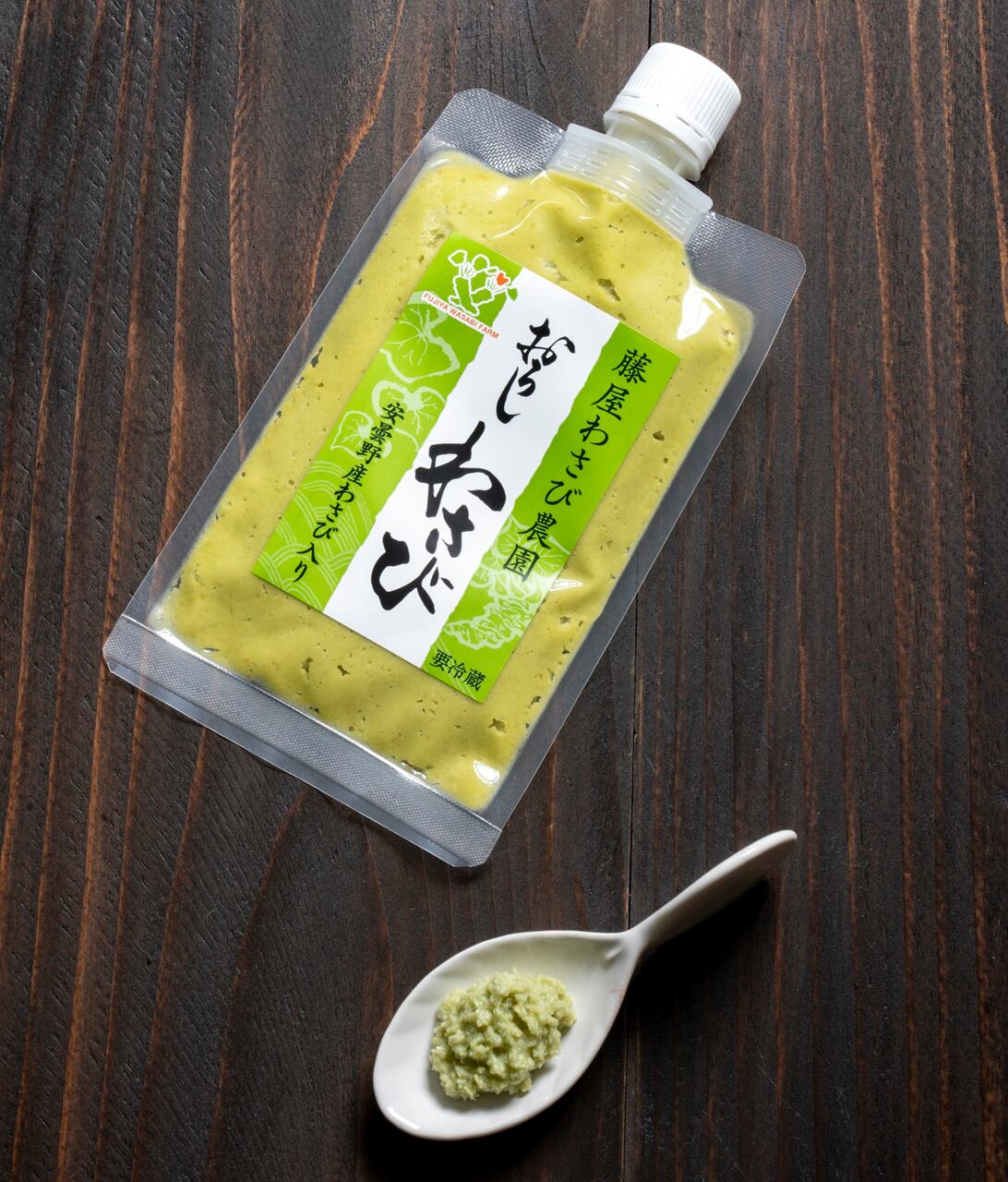 自社で育てた「本わさび」原料を使用して、練りわさびを作りました。 わさび原料を生育、加工、製造を弊社で一貫してこだ わりを持って作り上げた一品となって おります。一般 の方々にも手に取りやすいように100g規格にしまし た。